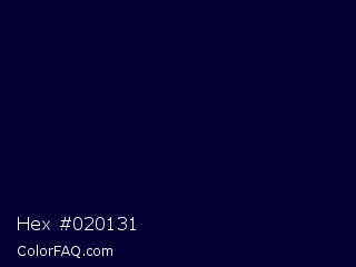 Hex #020131 Color is a very dark indigo color and the nearest color is Black Rock #0d0332. Hex code #020131 and RGB value is rgb(2,1,49). In RGB color space, this color is composed of 1% red, 0% green, 19% blue, In CMYK color space, this color is composed of 96% cyan, 98% magenta, 0% yellow , 81% black , In HSL color space, this color has a hue angle of 241° , 96% saturation and 10% lightness.