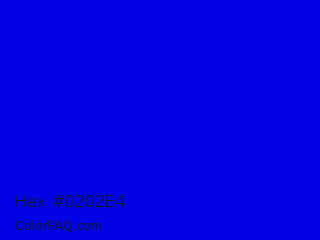 Hex #0202e4 Color is a normal blue color and the nearest color is Medium Blue #0000cd. Hex code #0202e4 and RGB value is rgb(2,2,228). In RGB color space, this color is composed of 1% red, 1% green, 89% blue, In CMYK color space, this color is composed of 99% cyan, 99% magenta, 0% yellow , 11% black , In HSL color space, this color has a hue angle of 240° , 98% saturation and 45% lightness.