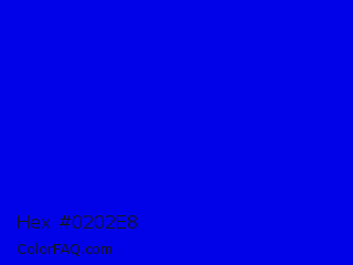 Hex #0202e8 Color is a normal blue color and the nearest color is Blue #0000ff. Hex code #0202e8 and RGB value is rgb(2,2,232). In RGB color space, this color is composed of 1% red, 1% green, 91% blue, In CMYK color space, this color is composed of 99% cyan, 99% magenta, 0% yellow , 9% black , In HSL color space, this color has a hue angle of 240° , 98% saturation and 46% lightness.
