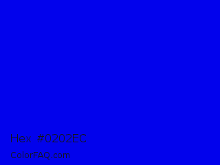 Hex #0202ec Color is a normal blue color and the nearest color is Blue #0000ff. Hex code #0202ec and RGB value is rgb(2,2,236). In RGB color space, this color is composed of 1% red, 1% green, 93% blue, In CMYK color space, this color is composed of 99% cyan, 99% magenta, 0% yellow , 7% black , In HSL color space, this color has a hue angle of 240° , 98% saturation and 47% lightness.