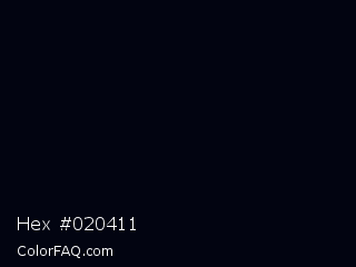Hex #020411 Color is a almost black blue color and the nearest color is Jaguar #080110. Hex code #020411 and RGB value is rgb(2,4,17). In RGB color space, this color is composed of 1% red, 2% green, 7% blue, In CMYK color space, this color is composed of 88% cyan, 76% magenta, 0% yellow , 93% black , In HSL color space, this color has a hue angle of 232° , 79% saturation and 4% lightness.