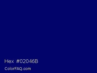 Hex #02046b Color is a very dark blue color and the nearest color is Arapawa #110c6c. Hex code #02046b and RGB value is rgb(2,4,107). In RGB color space, this color is composed of 1% red, 2% green, 42% blue, In CMYK color space, this color is composed of 98% cyan, 96% magenta, 0% yellow , 58% black , In HSL color space, this color has a hue angle of 239° , 96% saturation and 21% lightness.