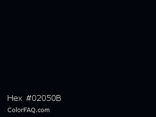 Hex #02050b Color is a almost black blue color and the nearest color is Rich Black FOGRA39 #010203. Hex code #02050b and RGB value is rgb(2,5,11). In RGB color space, this color is composed of 1% red, 2% green, 4% blue, In CMYK color space, this color is composed of 82% cyan, 55% magenta, 0% yellow , 96% black , In HSL color space, this color has a hue angle of 220° , 69% saturation and 3% lightness.