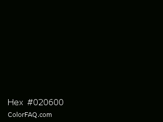 Hex #020600 Color is a almost black green color and the nearest color is Rich Black FOGRA39 #010203. Hex code #020600 and RGB value is rgb(2,6,0). In RGB color space, this color is composed of 1% red, 2% green, 0% blue, In CMYK color space, this color is composed of 67% cyan, 0% magenta, 100% yellow , 98% black , In HSL color space, this color has a hue angle of 100° , 100% saturation and 1% lightness.