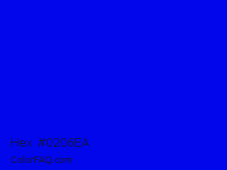 Hex #0206ea Color is a normal blue color and the nearest color is Blue #0000ff. Hex code #0206ea and RGB value is rgb(2,6,234). In RGB color space, this color is composed of 1% red, 2% green, 92% blue, In CMYK color space, this color is composed of 99% cyan, 97% magenta, 0% yellow , 8% black , In HSL color space, this color has a hue angle of 239° , 98% saturation and 46% lightness.