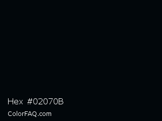 Hex #02070b Color is a almost black blue color and the nearest color is Rich Black FOGRA29 #010b13. Hex code #02070b and RGB value is rgb(2,7,11). In RGB color space, this color is composed of 1% red, 3% green, 4% blue, In CMYK color space, this color is composed of 82% cyan, 36% magenta, 0% yellow , 96% black , In HSL color space, this color has a hue angle of 207° , 69% saturation and 3% lightness.