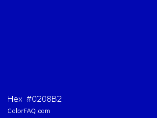 Hex #0208b2 Color is a normal blue color and the nearest color is Zaffre #0014a8. Hex code #0208b2 and RGB value is rgb(2,8,178). In RGB color space, this color is composed of 1% red, 3% green, 70% blue, In CMYK color space, this color is composed of 99% cyan, 96% magenta, 0% yellow , 30% black , In HSL color space, this color has a hue angle of 238° , 98% saturation and 35% lightness.