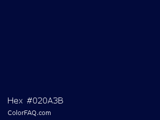 Hex #020a3b Color is a very dark blue color and the nearest color is Stratos #000741. Hex code #020a3b and RGB value is rgb(2,10,59). In RGB color space, this color is composed of 1% red, 4% green, 23% blue, In CMYK color space, this color is composed of 97% cyan, 83% magenta, 0% yellow , 77% black , In HSL color space, this color has a hue angle of 232° , 93% saturation and 12% lightness.