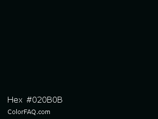 Hex #020b0b Color is a almost black cyan color and the nearest color is Rich Black FOGRA29 #010b13. Hex code #020b0b and RGB value is rgb(2,11,11). In RGB color space, this color is composed of 1% red, 4% green, 4% blue, In CMYK color space, this color is composed of 82% cyan, 0% magenta, 0% yellow , 96% black , In HSL color space, this color has a hue angle of 180° , 69% saturation and 3% lightness.