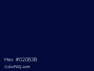 Hex #020b3b Color is a very dark blue color and the nearest color is Stratos #000741. Hex code #020b3b and RGB value is rgb(2,11,59). In RGB color space, this color is composed of 1% red, 4% green, 23% blue, In CMYK color space, this color is composed of 97% cyan, 81% magenta, 0% yellow , 77% black , In HSL color space, this color has a hue angle of 231° , 93% saturation and 12% lightness.