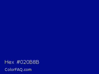 Hex #020b8b Color is a dark blue color and the nearest color is Phthalo Blue #000f89. Hex code #020b8b and RGB value is rgb(2,11,139). In RGB color space, this color is composed of 1% red, 4% green, 55% blue, In CMYK color space, this color is composed of 99% cyan, 92% magenta, 0% yellow , 45% black , In HSL color space, this color has a hue angle of 236° , 97% saturation and 28% lightness.
