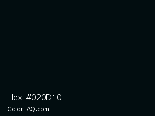 Hex #020d10 Color is a almost black cyan color and the nearest color is Rich Black FOGRA29 #010b13. Hex code #020d10 and RGB value is rgb(2,13,16). In RGB color space, this color is composed of 1% red, 5% green, 6% blue, In CMYK color space, this color is composed of 88% cyan, 19% magenta, 0% yellow , 94% black , In HSL color space, this color has a hue angle of 193° , 78% saturation and 4% lightness.