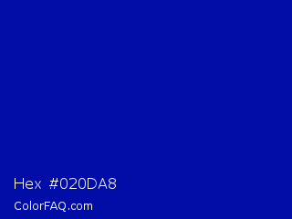 Hex #020da8 Color is a normal blue color and the nearest color is Zaffre #0014a8. Hex code #020da8 and RGB value is rgb(2,13,168). In RGB color space, this color is composed of 1% red, 5% green, 66% blue, In CMYK color space, this color is composed of 99% cyan, 92% magenta, 0% yellow , 34% black , In HSL color space, this color has a hue angle of 236° , 98% saturation and 33% lightness.