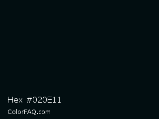 Hex #020e11 Color is a almost black cyan color and the nearest color is Rich Black FOGRA29 #010b13. Hex code #020e11 and RGB value is rgb(2,14,17). In RGB color space, this color is composed of 1% red, 5% green, 7% blue, In CMYK color space, this color is composed of 88% cyan, 18% magenta, 0% yellow , 93% black , In HSL color space, this color has a hue angle of 192° , 79% saturation and 4% lightness.