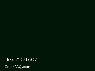 Hex #021607 Color is a almost black green color and the nearest color is Midnight Moss #041004. Hex code #021607 and RGB value is rgb(2,22,7). In RGB color space, this color is composed of 1% red, 9% green, 3% blue, In CMYK color space, this color is composed of 91% cyan, 0% magenta, 68% yellow , 91% black , In HSL color space, this color has a hue angle of 135° , 83% saturation and 5% lightness.