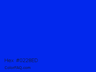 Hex #0228ed Color is a normal blue color and the nearest color is Bluebonnet #1c1cf0. Hex code #0228ed and RGB value is rgb(2,40,237). In RGB color space, this color is composed of 1% red, 16% green, 93% blue, In CMYK color space, this color is composed of 99% cyan, 83% magenta, 0% yellow , 7% black , In HSL color space, this color has a hue angle of 230° , 98% saturation and 47% lightness.