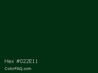Hex #022e11 Color is a almost black green color and the nearest color is English Holly #022d15. Hex code #022e11 and RGB value is rgb(2,46,17). In RGB color space, this color is composed of 1% red, 18% green, 7% blue, In CMYK color space, this color is composed of 96% cyan, 0% magenta, 63% yellow , 82% black , In HSL color space, this color has a hue angle of 140° , 92% saturation and 9% lightness.