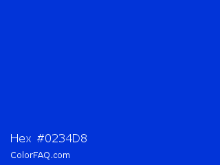 Hex #0234d8 Color is a normal blue color and the nearest color is Absolute Zero #0048ba. Hex code #0234d8 and RGB value is rgb(2,52,216). In RGB color space, this color is composed of 1% red, 20% green, 85% blue, In CMYK color space, this color is composed of 99% cyan, 76% magenta, 0% yellow , 15% black , In HSL color space, this color has a hue angle of 226° , 98% saturation and 43% lightness.