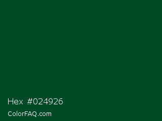 Hex #024926 Color is a very dark green color and the nearest color is Kaitoke Green #004620. Hex code #024926 and RGB value is rgb(2,73,38). In RGB color space, this color is composed of 1% red, 29% green, 15% blue, In CMYK color space, this color is composed of 97% cyan, 0% magenta, 48% yellow , 71% black , In HSL color space, this color has a hue angle of 150° , 95% saturation and 15% lightness.