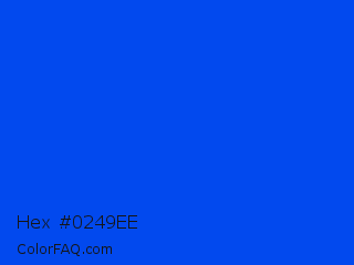 Hex #0249ee Color is a normal blue color and the nearest color is Blue RYB #0247fe. Hex code #0249ee and RGB value is rgb(2,73,238). In RGB color space, this color is composed of 1% red, 29% green, 93% blue, In CMYK color space, this color is composed of 99% cyan, 69% magenta, 0% yellow , 7% black , In HSL color space, this color has a hue angle of 222° , 98% saturation and 47% lightness.