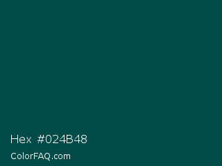 Hex #024b48 Color is a very dark cyan color and the nearest color is Deep Jungle Green #004b49. Hex code #024b48 and RGB value is rgb(2,75,72). In RGB color space, this color is composed of 1% red, 29% green, 28% blue, In CMYK color space, this color is composed of 97% cyan, 0% magenta, 4% yellow , 71% black , In HSL color space, this color has a hue angle of 178° , 95% saturation and 15% lightness.