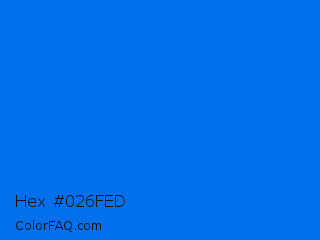 Hex #026fed Color is a normal blue color and the nearest color is Brandeis Blue #0070ff. Hex code #026fed and RGB value is rgb(2,111,237). In RGB color space, this color is composed of 1% red, 44% green, 93% blue, In CMYK color space, this color is composed of 99% cyan, 53% magenta, 0% yellow , 7% black , In HSL color space, this color has a hue angle of 212° , 98% saturation and 47% lightness.