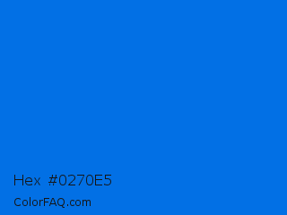 Hex #0270e5 Color is a normal blue color and the nearest color is True Blue #0073cf. Hex code #0270e5 and RGB value is rgb(2,112,229). In RGB color space, this color is composed of 1% red, 44% green, 90% blue, In CMYK color space, this color is composed of 99% cyan, 51% magenta, 0% yellow , 10% black , In HSL color space, this color has a hue angle of 211° , 98% saturation and 45% lightness.