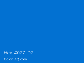 Hex #0271d2 Color is a normal blue color and the nearest color is True Blue #0073cf. Hex code #0271d2 and RGB value is rgb(2,113,210). In RGB color space, this color is composed of 1% red, 44% green, 82% blue, In CMYK color space, this color is composed of 99% cyan, 46% magenta, 0% yellow , 18% black , In HSL color space, this color has a hue angle of 208° , 98% saturation and 42% lightness.