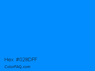 Hex #028dff Color is a normal blue color and the nearest color is Azure Radiance #007fff. Hex code #028dff and RGB value is rgb(2,141,255). In RGB color space, this color is composed of 1% red, 55% green, 100% blue, In CMYK color space, this color is composed of 99% cyan, 45% magenta, 0% yellow , 0% black , In HSL color space, this color has a hue angle of 207° , 100% saturation and 50% lightness.