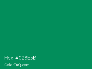 Hex #028e5b Color is a dark green color and the nearest color is Spanish Green #009150. Hex code #028e5b and RGB value is rgb(2,142,91). In RGB color space, this color is composed of 1% red, 56% green, 36% blue, In CMYK color space, this color is composed of 99% cyan, 0% magenta, 36% yellow , 44% black , In HSL color space, this color has a hue angle of 158° , 97% saturation and 28% lightness.
