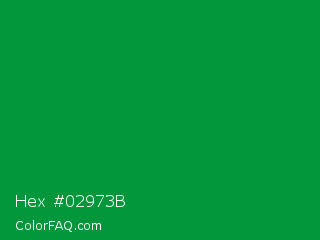 Hex #02973b Color is a dark green color and the nearest color is North Texas Green #059033. Hex code #02973b and RGB value is rgb(2,151,59). In RGB color space, this color is composed of 1% red, 59% green, 23% blue, In CMYK color space, this color is composed of 99% cyan, 0% magenta, 61% yellow , 41% black , In HSL color space, this color has a hue angle of 143° , 97% saturation and 30% lightness.
