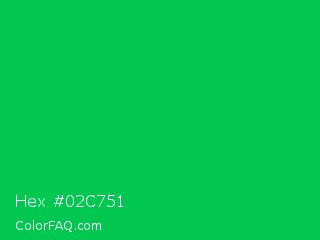Hex #02c751 Color is a normal green color and the nearest color is Malachite #0bda51. Hex code #02c751 and RGB value is rgb(2,199,81). In RGB color space, this color is composed of 1% red, 78% green, 32% blue, In CMYK color space, this color is composed of 99% cyan, 0% magenta, 59% yellow , 22% black , In HSL color space, this color has a hue angle of 144° , 98% saturation and 39% lightness.