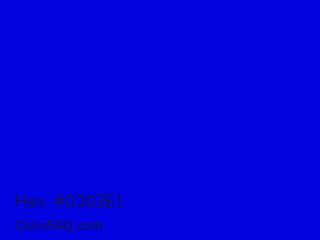 Hex #0303e1 Color is a normal blue color and the nearest color is Medium Blue #0000cd. Hex code #0303e1 and RGB value is rgb(3,3,225). In RGB color space, this color is composed of 1% red, 1% green, 88% blue, In CMYK color space, this color is composed of 99% cyan, 99% magenta, 0% yellow , 12% black , In HSL color space, this color has a hue angle of 240° , 97% saturation and 45% lightness.
