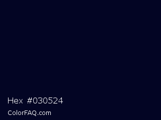 Hex #030524 Color is a almost black blue color and the nearest color is Black Russian #0a001c. Hex code #030524 and RGB value is rgb(3,5,36). In RGB color space, this color is composed of 1% red, 2% green, 14% blue, In CMYK color space, this color is composed of 92% cyan, 86% magenta, 0% yellow , 86% black , In HSL color space, this color has a hue angle of 236° , 85% saturation and 8% lightness.