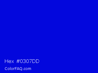 Hex #0307dd Color is a normal blue color and the nearest color is Medium Blue #0000cd. Hex code #0307dd and RGB value is rgb(3,7,221). In RGB color space, this color is composed of 1% red, 3% green, 87% blue, In CMYK color space, this color is composed of 99% cyan, 97% magenta, 0% yellow , 13% black , In HSL color space, this color has a hue angle of 239° , 97% saturation and 44% lightness.