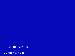 Hex #0309b8 Color is a normal blue color and the nearest color is Dark Blue #0000c8. Hex code #0309b8 and RGB value is rgb(3,9,184). In RGB color space, this color is composed of 1% red, 4% green, 72% blue, In CMYK color space, this color is composed of 98% cyan, 95% magenta, 0% yellow , 28% black , In HSL color space, this color has a hue angle of 238° , 97% saturation and 37% lightness.