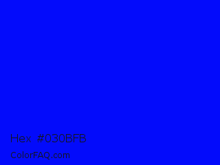 Hex #030bfb Color is a normal blue color and the nearest color is Blue #0000ff. Hex code #030bfb and RGB value is rgb(3,11,251). In RGB color space, this color is composed of 1% red, 4% green, 98% blue, In CMYK color space, this color is composed of 99% cyan, 96% magenta, 0% yellow , 2% black , In HSL color space, this color has a hue angle of 238° , 98% saturation and 50% lightness.
