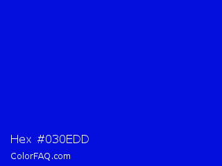 Hex #030edd Color is a normal blue color and the nearest color is Medium Blue #0000cd. Hex code #030edd and RGB value is rgb(3,14,221). In RGB color space, this color is composed of 1% red, 5% green, 87% blue, In CMYK color space, this color is composed of 99% cyan, 94% magenta, 0% yellow , 13% black , In HSL color space, this color has a hue angle of 237° , 97% saturation and 44% lightness.