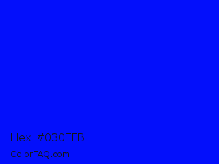 Hex #030ffb Color is a normal blue color and the nearest color is Blue #0000ff. Hex code #030ffb and RGB value is rgb(3,15,251). In RGB color space, this color is composed of 1% red, 6% green, 98% blue, In CMYK color space, this color is composed of 99% cyan, 94% magenta, 0% yellow , 2% black , In HSL color space, this color has a hue angle of 237° , 98% saturation and 50% lightness.