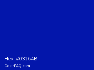 Hex #0316ab Color is a normal blue color and the nearest color is Blue Pantone #0018a8. Hex code #0316ab and RGB value is rgb(3,22,171). In RGB color space, this color is composed of 1% red, 9% green, 67% blue, In CMYK color space, this color is composed of 98% cyan, 87% magenta, 0% yellow , 33% black , In HSL color space, this color has a hue angle of 233° , 97% saturation and 34% lightness.