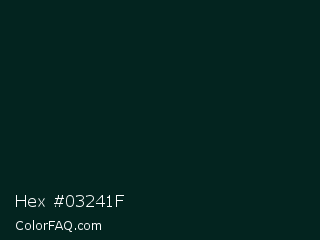Hex #03241f Color is a almost black cyan color and the nearest color is Swamp #001b1c. Hex code #03241f and RGB value is rgb(3,36,31). In RGB color space, this color is composed of 1% red, 14% green, 12% blue, In CMYK color space, this color is composed of 92% cyan, 0% magenta, 14% yellow , 86% black , In HSL color space, this color has a hue angle of 171° , 85% saturation and 8% lightness.