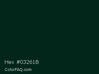 Hex #03261b Color is a almost black green color and the nearest color is English Holly #022d15. Hex code #03261b and RGB value is rgb(3,38,27). In RGB color space, this color is composed of 1% red, 15% green, 11% blue, In CMYK color space, this color is composed of 92% cyan, 0% magenta, 29% yellow , 85% black , In HSL color space, this color has a hue angle of 161° , 85% saturation and 8% lightness.
