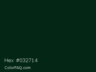 Hex #032714 Color is a almost black green color and the nearest color is English Holly #022d15. Hex code #032714 and RGB value is rgb(3,39,20). In RGB color space, this color is composed of 1% red, 15% green, 8% blue, In CMYK color space, this color is composed of 92% cyan, 0% magenta, 49% yellow , 85% black , In HSL color space, this color has a hue angle of 148° , 86% saturation and 8% lightness.