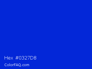 Hex #0327d8 Color is a normal blue color and the nearest color is Bluebonnet #1c1cf0. Hex code #0327d8 and RGB value is rgb(3,39,216). In RGB color space, this color is composed of 1% red, 15% green, 85% blue, In CMYK color space, this color is composed of 99% cyan, 82% magenta, 0% yellow , 15% black , In HSL color space, this color has a hue angle of 230° , 97% saturation and 43% lightness.