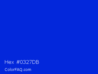 Hex #0327db Color is a normal blue color and the nearest color is Bluebonnet #1c1cf0. Hex code #0327db and RGB value is rgb(3,39,219). In RGB color space, this color is composed of 1% red, 15% green, 86% blue, In CMYK color space, this color is composed of 99% cyan, 82% magenta, 0% yellow , 14% black , In HSL color space, this color has a hue angle of 230° , 97% saturation and 44% lightness.