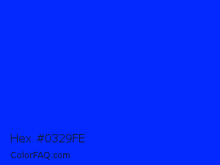 Hex #0329fe Color is a normal blue color and the nearest color is Blue RYB #0247fe. Hex code #0329fe and RGB value is rgb(3,41,254). In RGB color space, this color is composed of 1% red, 16% green, 100% blue, In CMYK color space, this color is composed of 99% cyan, 84% magenta, 0% yellow , 0% black , In HSL color space, this color has a hue angle of 231° , 99% saturation and 50% lightness.