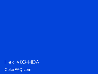 Hex #0344da Color is a normal blue color and the nearest color is Absolute Zero #0048ba. Hex code #0344da and RGB value is rgb(3,68,218). In RGB color space, this color is composed of 1% red, 27% green, 85% blue, In CMYK color space, this color is composed of 99% cyan, 69% magenta, 0% yellow , 15% black , In HSL color space, this color has a hue angle of 222° , 97% saturation and 43% lightness.