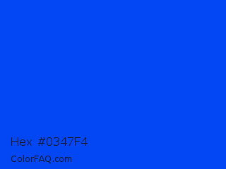 Hex #0347f4 Color is a normal blue color and the nearest color is Blue RYB #0247fe. Hex code #0347f4 and RGB value is rgb(3,71,244). In RGB color space, this color is composed of 1% red, 28% green, 96% blue, In CMYK color space, this color is composed of 99% cyan, 71% magenta, 0% yellow , 4% black , In HSL color space, this color has a hue angle of 223° , 98% saturation and 48% lightness.