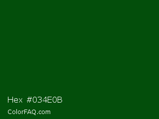Hex #034e0b Color is a very dark green color and the nearest color is Dark Fern #0a480d. Hex code #034e0b and RGB value is rgb(3,78,11). In RGB color space, this color is composed of 1% red, 31% green, 4% blue, In CMYK color space, this color is composed of 96% cyan, 0% magenta, 86% yellow , 69% black , In HSL color space, this color has a hue angle of 126° , 93% saturation and 16% lightness.