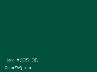 Hex #03513d Color is a very dark cyan color and the nearest color is Sacramento State Green #00563f. Hex code #03513d and RGB value is rgb(3,81,61). In RGB color space, this color is composed of 1% red, 32% green, 24% blue, In CMYK color space, this color is composed of 96% cyan, 0% magenta, 25% yellow , 68% black , In HSL color space, this color has a hue angle of 165° , 93% saturation and 16% lightness.